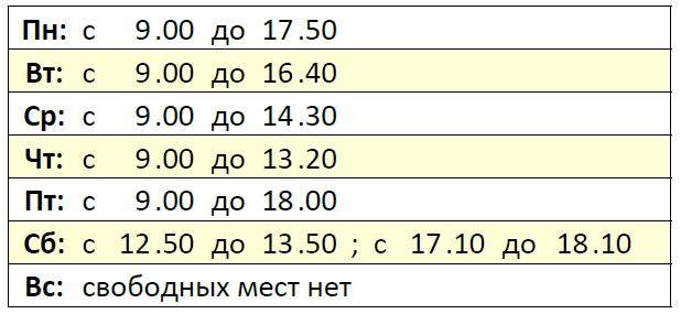 Пояснение 2: Если, например, интервал свободного времени указан до 15.00, то последнее занятие может быть проведено с 14.00 до 15.00.